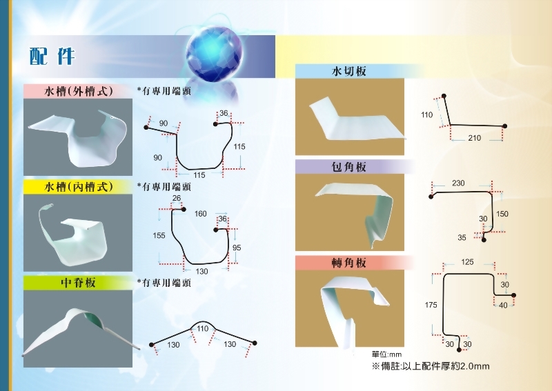 中脊板、水切板、包角板和轉角板,配件厚度約2.0mm